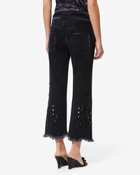 Black cotton denim pants Kick flare cut Concealed front fastening: zipper and double metal snap buttons Adjustable waistband with twisted drawstring and embroidered eyelet details 2 classic side pockets, 2 patch back pockets Geometric broderie anglaise on the lower leg Fringed finishes Style: PA0694FAD2H01I01BK 100% cotton (1) Care & Sustainability Machine wash on a gentle cycle, inside out and at a maximum temperature of 30°C For more details, see the instructions on the composition label the history and environmental impact of this product
