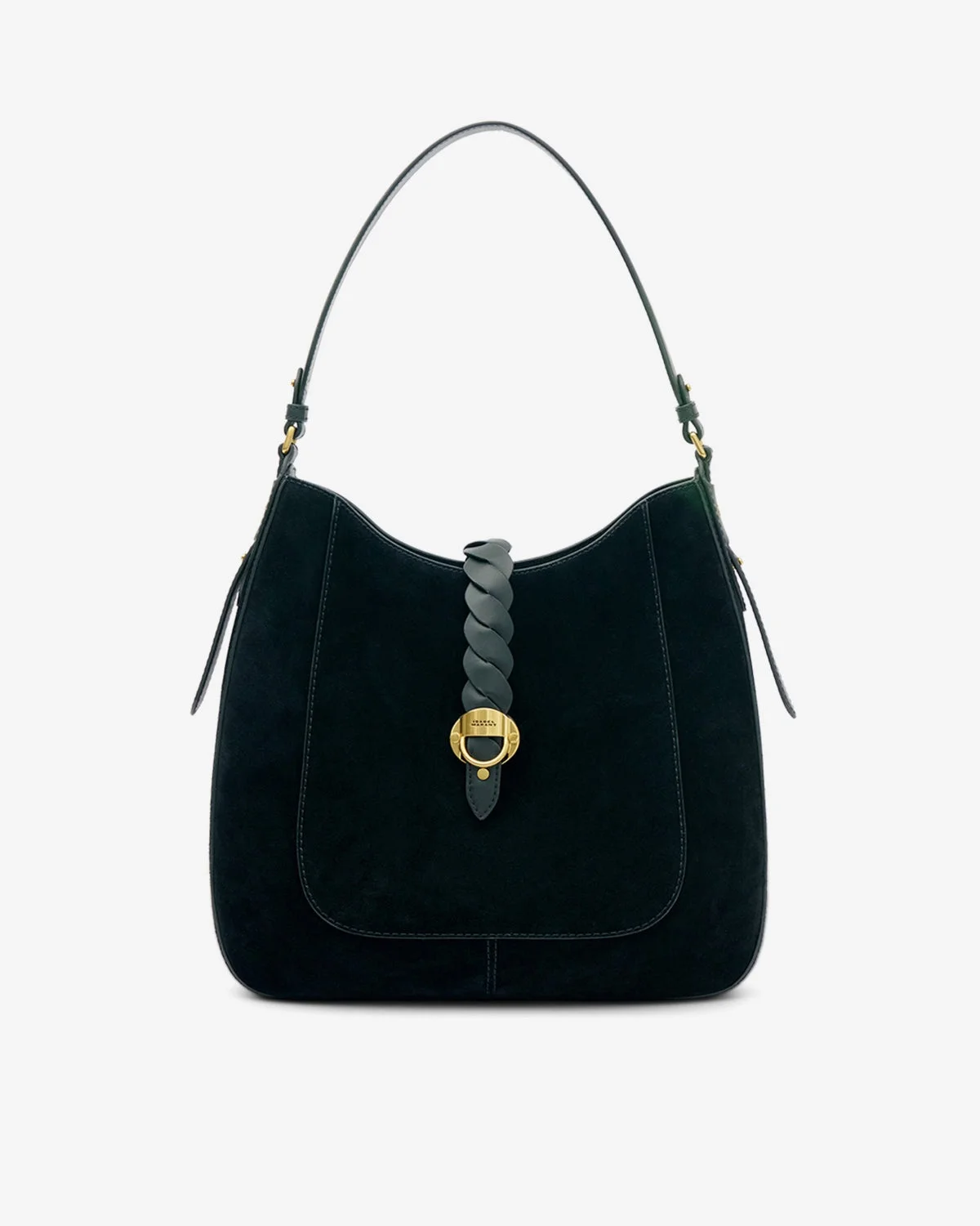 Shoulder bag in suede calfskin leather Carried by hand or on the shoulder Smooth leather handle Metal rings Magnetic fastener Smooth interlaced leather tab Metal clasp with "Isabel Marant" engraving Gold-finish metal details Twill lining Zippered inside pocket Size: 37.5 x 35 x 5.5 cm / 14.8 x 13.8 x 2.2 in. 100% suede calfskin leather