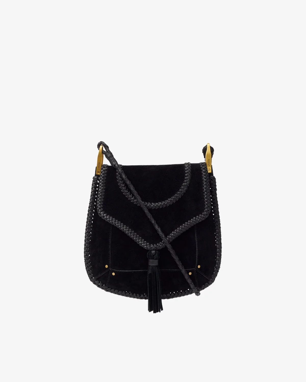 Shoulder bag in braided suede leather Carried on the shoulder or crossbody style Smooth braided leather shoulder strap Metal rings with "Isabel Marant" engravings Braided suede leather flaps Smooth braided leather finishes Magnetic fastener Gold-finish metal details Embossed leather pocket inside Size: 23.5 x 23 x 0.5 cm / 9.3 x 9.1 x 0.2 in. Style: PP0342FAC2C11M01BK ANAHI 100% suede calfskin leather