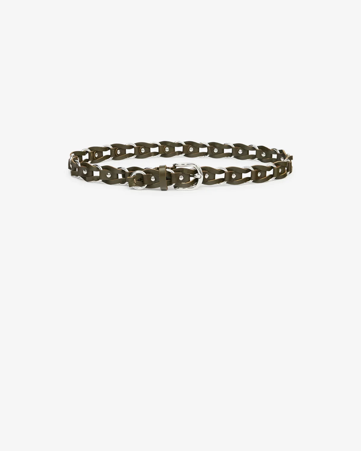 Metal mesh and cowhide leather belt Low-waist fit Adjustable with a metal buckle Metal rings and studded leather loops 100% bovine leather
