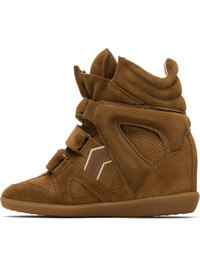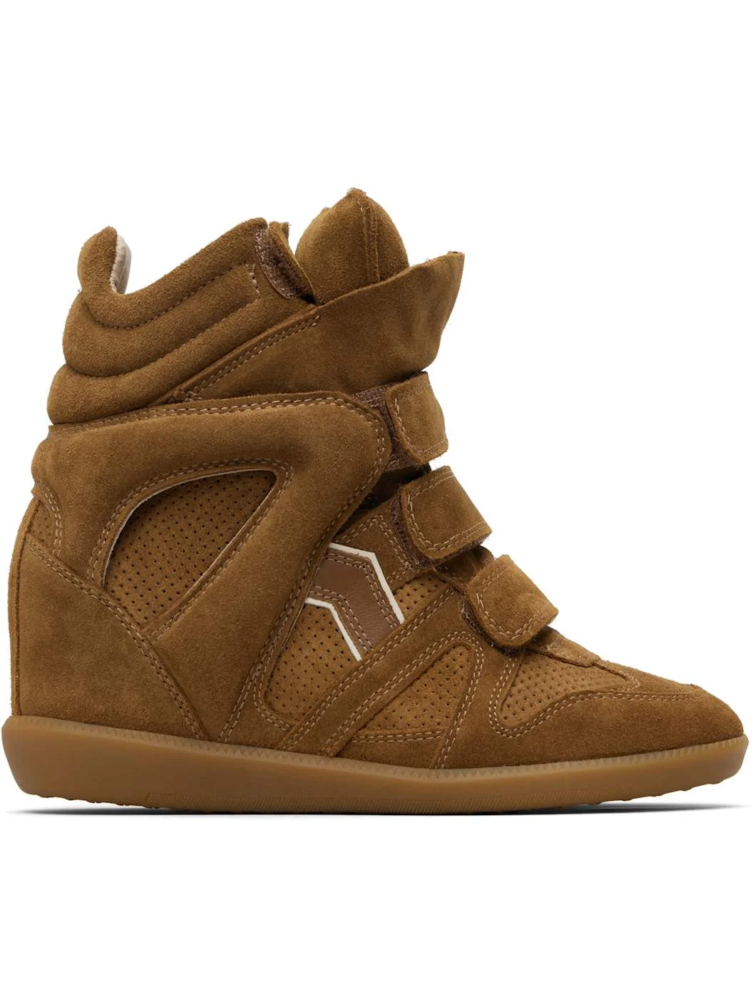 High-top suede sneakers. · Perforated detailing throughout · Velcro closure · Padded tongue and quilted padded collar · Padded applique with cutout at sides · Grained leather lining · Concealed wedge heel · Treaded rubber sole · Heel: H3" Supplier color: Cognac Upper: leather. Sole: rubber. Made in Portugal 261600F127016