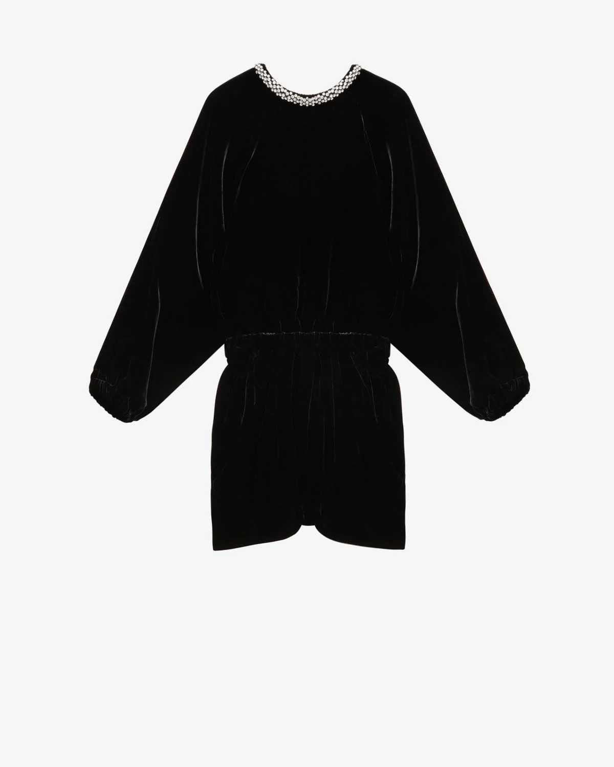 Gathered dress in plain-colored velvet with rhinestones Padded round neckline adorned with rhinestones Wide armholes Long sleeves Elasticated cuffs Elastic waistband Slant pockets on the sides Satin lining Relaxed fit 82% polyester, 18% silk
