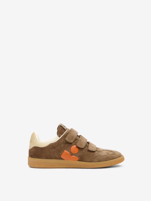 Low-top suede, sheepskin leather, and calfskin leather sneakers Round toes Padded tongues with a logo label Velcro straps Yoke on the side with a contrasting "IM" logo Contrasting yoke in back with an embossed "Isabel Marant" logo Soft leather insoles and lining Rubber outsoles Style: BK0013FAC1E09SPIPH BETH 100% bovine leather
