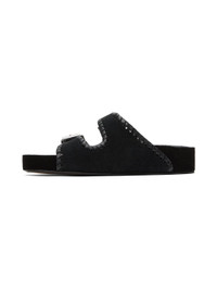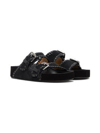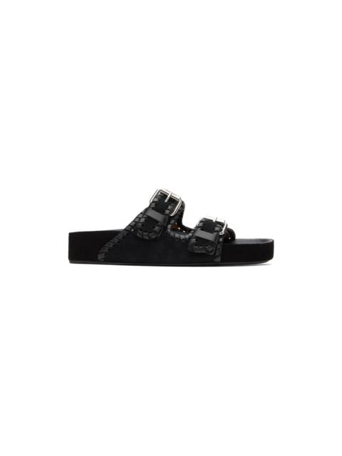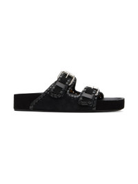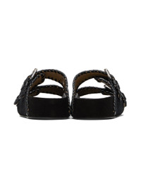 Calfskin suede flat sandals in black. · Woven buffed calfskin trim throughout · Open toe · Pin-buckle straps at vamp · Logo embossed at molded calfskin footbed · Buffed calfskin lining · Covered midsole · Leather sole with rubber injection Supplier color: Black Upper: calfskin. Sole: leather, rubber. Made in Portugal 242600F124001