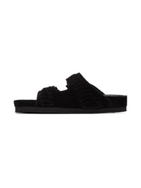 Calfskin suede slip-on sandals in black. Braided detailing throughout. · Open round toe · Adjustable pin-buckle straps at vamp · Logo embossed at molded calfskin footbed · Treaded foam rubber sole Supplier color: Black Upper: calfskin. Sole: rubber. Made in Portugal 231600F124024