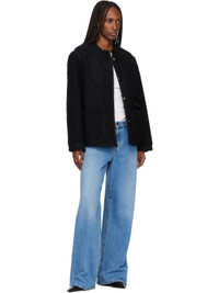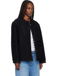 Acrylic- and wool-blend boucle tweed jacket. · Faux-suede trim throughout · Frayed edge at band collar and cuffs · Button closure · Welt pocket and patch pockets at front · Partially lining Supplier color: Black Body: 46% acrylic, 38% wool, 16% polyester. Trim 1: 60% polyester, 40% polyurethane. Trim 2: 100% cotton. Made in Poland 261600F063002