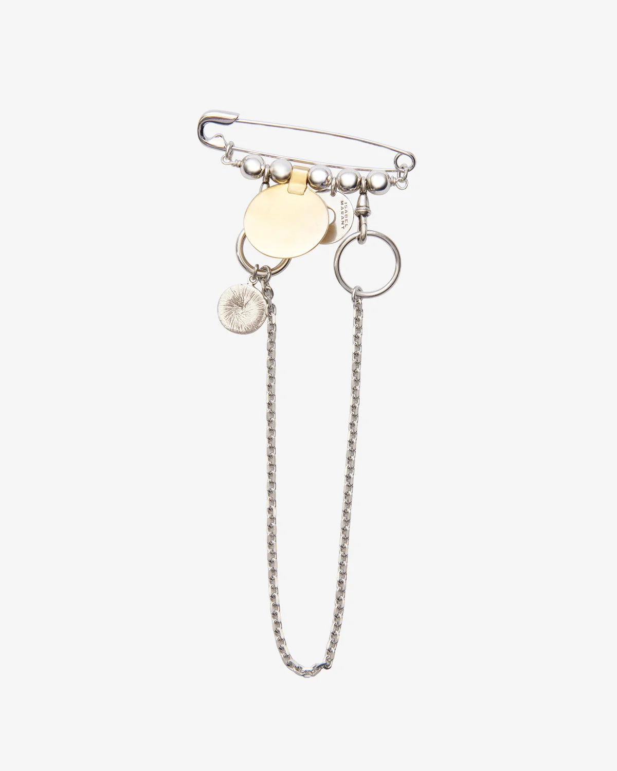 Gold and silver-finished brass brooch with chain, tassels, and snap hooks Engraved "Isabel Marant" logo Safety pin Removable accessories Style: BC0010FAC4B14BSIDO PENDANT BROOCH Brass