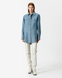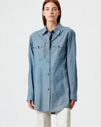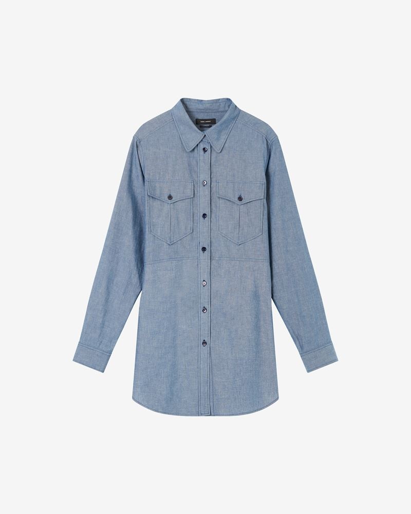 Greyish blue chambray short shirt dress with long sleeves The model is wearing a size FR 36 and she is 1m77 Reference : RO2341-22H018I BRIDGET 100% Cotton FITTING ADVICE Fits true to size