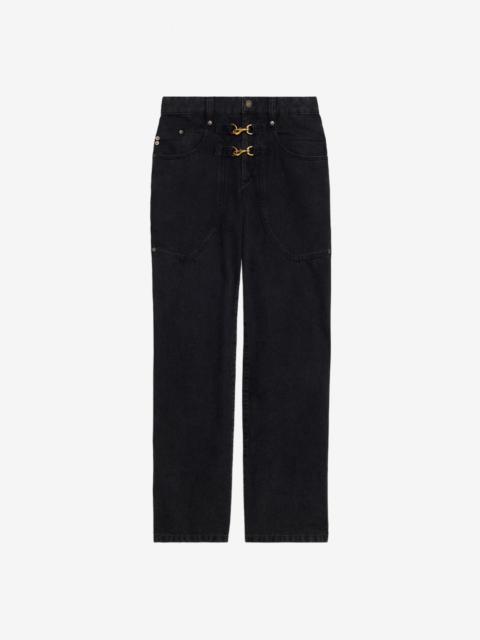 Pants in a blend of cotton and hemp Fitted waistband with loops 5 classic pockets Engraved metal button tab with a zipper Snap hooks in front Rounded front seams Leather label in back with an "Isabel Marant" logo Metal rivets Loose fit Style: PA0425FC-B4H02I BRINLEY 80% cotton, 20% hemp