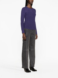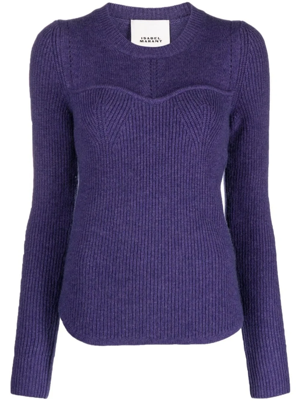 Brumea merino wool-blend jumper It’s the details that set this ISABEL MARANT’s purple Brumea jumper apart – the decolletage is trimmed with delicate pointelle eyelets and a curved seam that creates the illusion of a bustier neckline. Highlights - Purple - Merino wool blend - Ribbed knit - Pointelle trim - Bustier seam detailing - Crew neck - Long sleeves - Straight hem Imported Composition Merino 66%, Cashmere 28%, Polyamide 5%, Elastane 1% SIZE & FIT Model measurements Height 5 ft 11 in(1.8 m) Bust/Chest 34.25 in(87 cm) Hips 35.82 in(91 cm) Waist 24.8 in(63 cm) FittingInformation Designed for a slim fit that sits just away from the body offering a close yet comfortable fit Made with a midweight knit, this piece offers some stretch This piece fits true to size – take your usual size Washing instructions Hand Wash