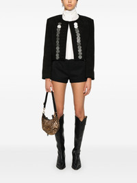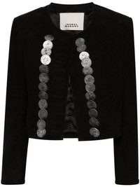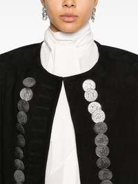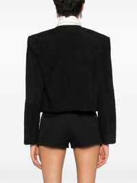 Camila suede jacket Highlights - Black - Goat suede - Collarless - Round neck - Shoulder pads - Long sleeves - Cropped - Straight hem - Full logo-jacquard lining - Embossed silver-tone buttons - Front button fastening Imported Composition Outer: Goat Skin 100% Lining: Viscose 100% SIZE & FIT Model measurements Height 5 ft 9 in(1.76 m) Bust/Chest 31.88 in(81 cm) Hips 35.43 in(90 cm) Waist 24.8 in(63 cm) FittingInformation Designed for a boxy fit, intended for a loose fit throughout The internal shoulder pads offer a structured shape Suede leather has a soft and treated construction offering some flexibility This piece fits true to size – take your usual size Washing instructions Specialist Cleaning