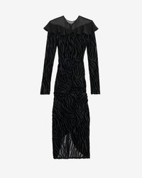 Midi zebra pattern burnout velvet wrap dress Round neckline with fishnet yoke Silk crepe ruffles on the upper chest Long sleeves with slit cuffs Fitted waist and draped skirt with slit Fitted cut Style: RO0897FB-C4J24I CAMY 64% viscose, 36% silk