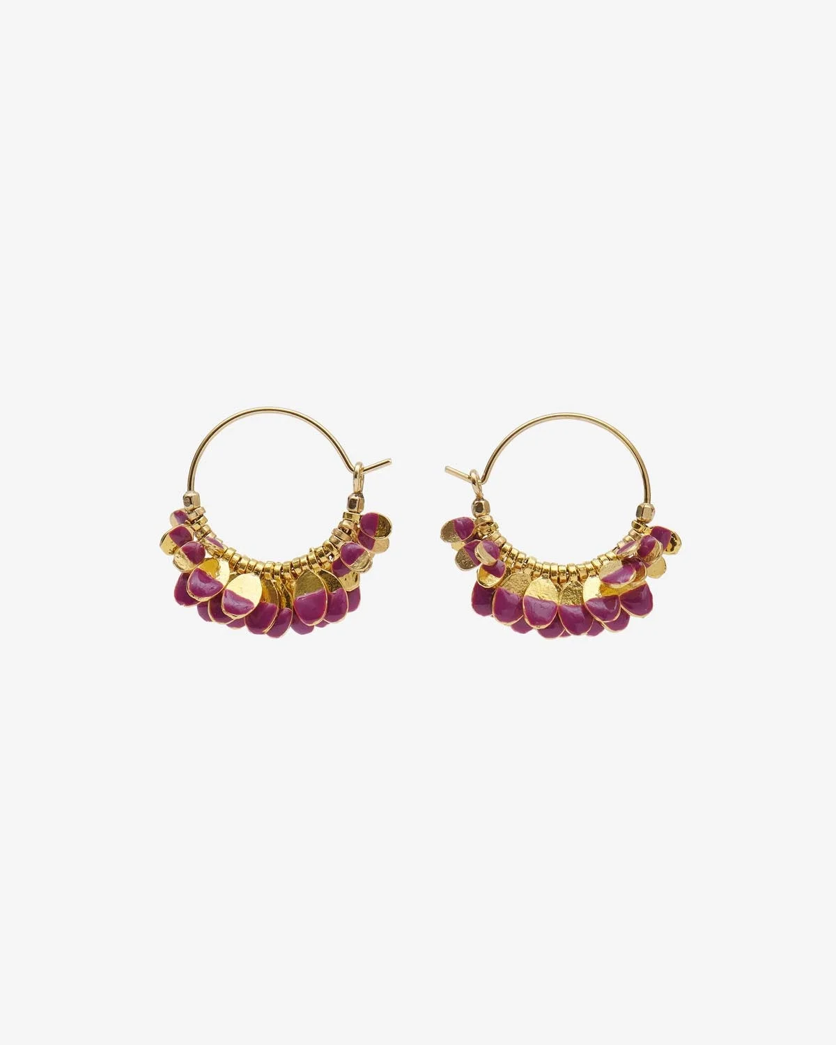 Hoop earrings with tassels Tin and golden brass Semi-enameled tassels with contrasting resin Hook clasp Diameter: 2 cm / 0.8 in. 60% tin, 35% brass, 5% resin