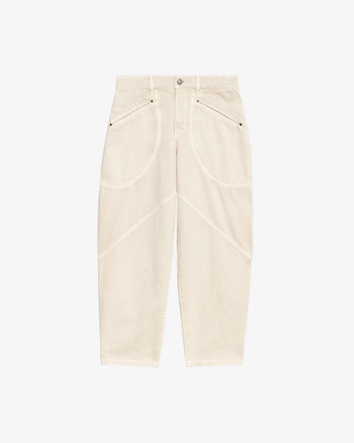 Denim jeans with topstitched details Fitted waistband with loops Engraved button and hidden zipper Piped side pockets Topstitched seams Leather label in back with an embossed "Isabel Marant" logo Patch pockets on the back Antique gold-finish metal details Medium-rise waist Relaxed straight cut Style: PA0369FCC3H01I23EC CATARINA 80% cotton, 20% hemp