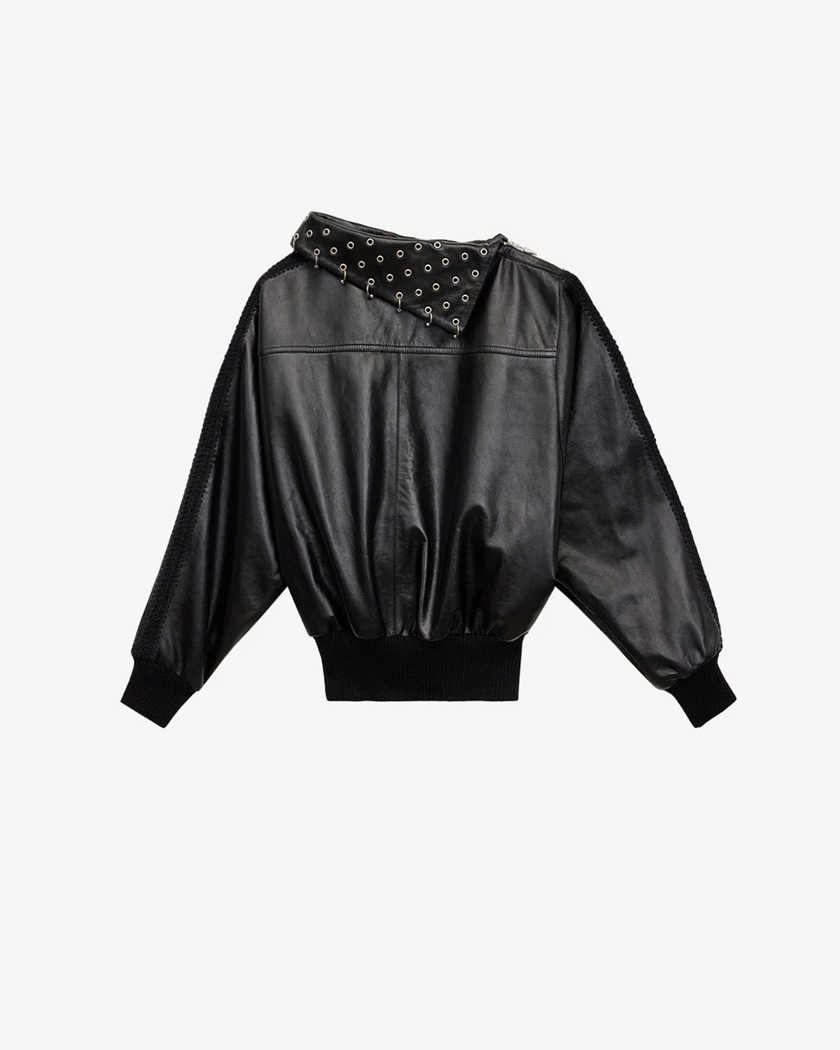 Leather sweatshirt Draped stand-up collar with metal rings and details Decorative shoulder zippers with engraved sliders Long sleeves with dropped armholes and full-length strips of hook fasteners Ribbed finishes Relaxed fit Style: HT0774FA-C4B01I CENDRINE 100% lambskin leather