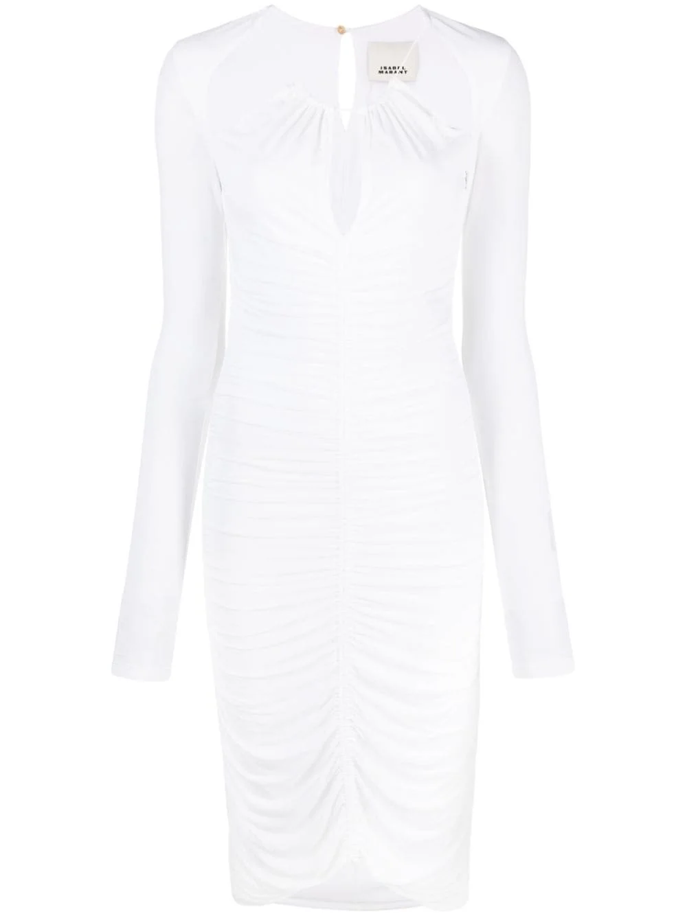 Logane cut-out midi dress Cut to a silhouette-hugging fit, this white midi dress reflects ISABEL MARANT’s penchant for understated silhouettes with an interesting twist. It’s punctuated with geometric cut-outs and considered ruching. Highlights - White - Stretch-jersey - Cut-out detailing - Ruched detailing - Halterneck - Long sleeves - Keyhole detail to the rear - Mid-calf length - Asymmetric hem Imported Composition Viscose 92%, Elastane 8% SIZE & FIT Model measurements Height 5 ft 10 in(1.78 m) Bust/Chest 31.49 in(80 cm) Hips 36.22 in(92 cm) Waist 25.59 in(65 cm) FittingInformation Designed for a close fit throughout Made from a midweight stretch fabric, this piece offers elasticity and flexibility when worn This piece fits true to size – take your usual size Washing instructions Hand Wash