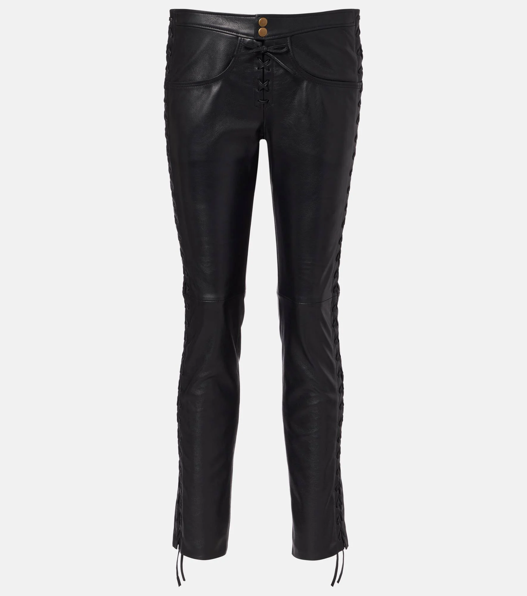 Inspired by Parisian style, each Isabel Marant piece blends refined design with effortless looks for daily life. The Cyerra leather pants have a low-rise silhouette and feature leather lacing up the sides of each leg. Product Details - Material: 100% cow leather - Care instructions: specialist clean - Made in India - Designer color name: Black - Item color: black - Lining: 53% viscose, 47% cupro - Pocket lining: 100% cotton - Hardware color: antique gold - Closure: snap-buttoned fastenings - Pockets: slant pockets, back pockets - Fully lined - Item number: P01074371 Size & Fit - Fits small to size - we recommend trying one size larger - Non-stretchy fabric - Leather relaxes over time - Slim-leg - Sits low on the hips - The model seen in the picture is 178cm-5'10" and wearing a size FR 38