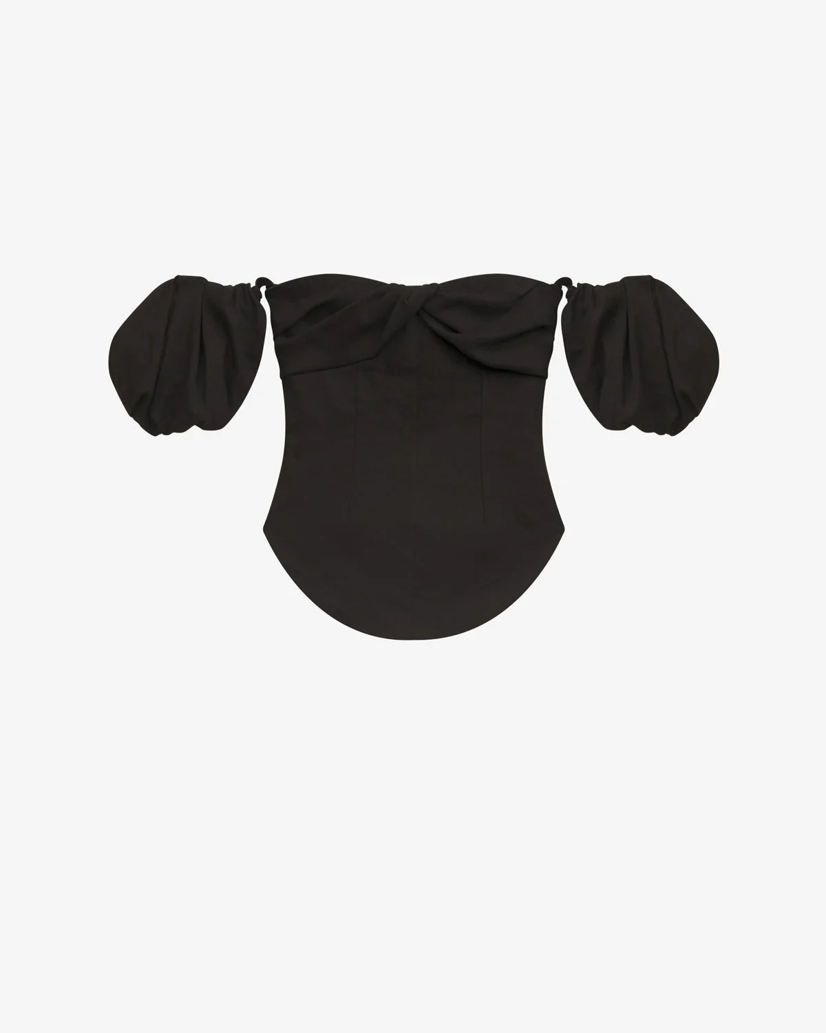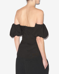 Strapless top with removable sleeves Twisted detail on the chest Short balloon sleeves Removable sleeves with buttoned tabs Done up in back with a hook and a hidden zipper Anti-slip strip on the inside Whale pattern lining Short and fitted cut Style: HT0507FA-B1F04I DANIELA 58% hemp, 39% viscose, 3% elastane
