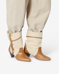 Draped two-toned cotton and calfskin leather boots Soft turn-down uppers secured by a strap with an adjustable side buckle Almond-shaped toes Laminated leather cone heels Soft leather insoles/outsoles and lining Heel height: 5.5 cm / 2.2 in. Style: BO0258FAD1A24SECCN DARNER 60% cotton, 40% bovine leather Care & Sustainability the history and environmental impact of this product