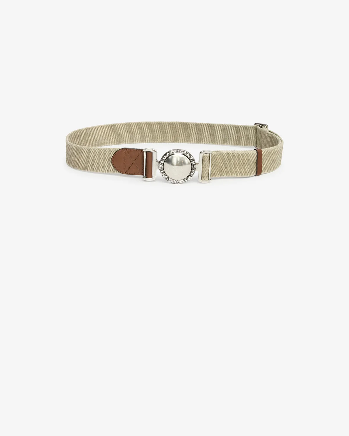 Woven cotton belt with metal eyelets Regular fit Adjustable round metal buckle with "Isabel Marant" engraving Khaki leather loop Silver-finish metal details Style: CE448XFAD2B10A67KI 100% cotton