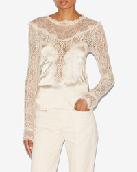 Silk satin blend top with lace yokes Round neckline Lacy top and sleeves Long sleeves Lace braid neckline and cuff finishes Satin yoke with rounded seams Buttoned neck and zippered side Fitted cut Style: HT0694FAC3J05I23CH DIEM 94% silk, 6% Lycra