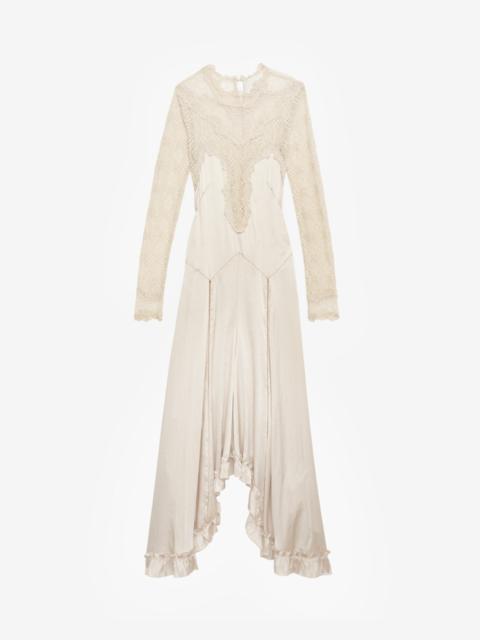 Long silk satin and lace dress Round neckline Lacy top and sleeves Long sleeves Lace neckline and cuff finishes Satin yoke with rounded seams Flared ruffled satin skirt Buttoned neck and zippered side Flared and fitted Style: RO0855FAC3J05IBKMD DOLORES 94% silk, 6% Lycra