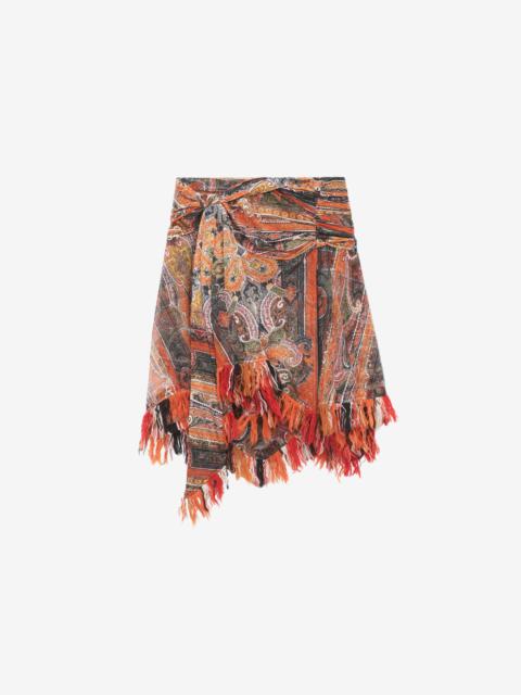 Draped skirt in printed elasticated tulle Tied and draped in front Done up on the side with a hook and a hidden zipper Fringed finishes Asymmetrical hem Short and flowing Style: JU0350FAC2J06I11OR DOVA 100% polyamide