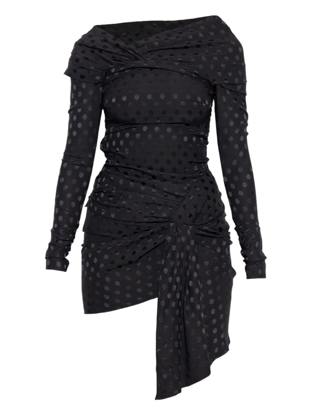 draped polka-dot mini dress Highlights - Black - Polka-dot pattern - Draped detailing - Long sleeves - Knot detail - Asymmetric hem Imported Composition Fabric 100% Washing instructions Read Manufacturer Guidelines