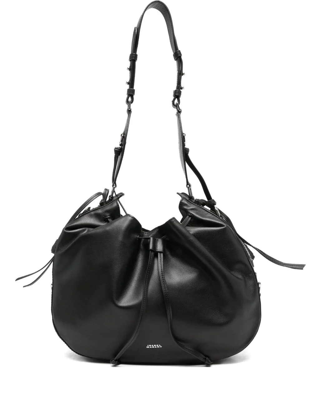 drawstring leather shoulder bag Highlights - Black - Leather material - Drawstring closure - Adjustable shoulder strap - Silver-tone hardware Imported Composition Lining: Cotton 100% Outer: Leather 100% SIZE & FIT Model measurements Height 5 ft 9 in(1.75 m) Bust/Chest 34.64 in(88 cm) Hips 36.61 in(93 cm) Waist 26.37 in(67 cm)
