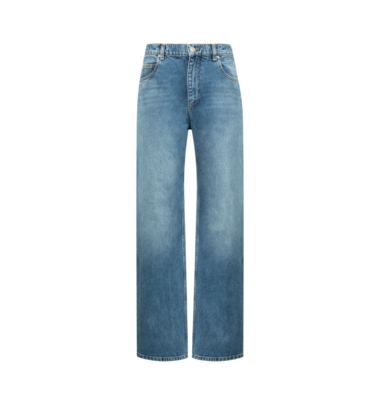 ISABEL MARANT Dromie Jean featuring 5-pocket straight-leg cotton denim jeans, fitted waistband with loops, "Isabel Marant" engraved metal button and concealed zipper fly, leather label in back with an embossed "Isabel Marant" logo, relaxed straight legs and medium-rise waist. 100% cotton. DESIGNER STYLE ID: 26PPA0636FA-D1H04I COLOR: 30LU LIGHT BLUE