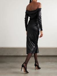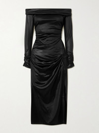 Isabel Marant's dress is made from satin-jersey with a liquid-like shine that enhances the fluid drape. It's designed to sit elegantly off the shoulders and is gathered at the hip and cuffs for a sculptural shape. Wear it with your favorite pumps. Size & Fit - Fits true to size, however those who are between sizes should take the smaller size - Cut to be fitted at the bust and waist, slightly loose at the hip - Elasticated at the neckline for a flexible fit - Lightweight, stretchy fabric - Model is 180cm/ 5'11" and is wearing a FR 36 Model measurements: - Bust: 80cm/ 31.5" - Waist: 65cm/ 25.5" - Hip: 89cm/ 35" Details & Care - Black satin-jersey - Concealed zip fastening along side - 70% acetate, 30% polyamide - Unlined - Hand wash or dry clean