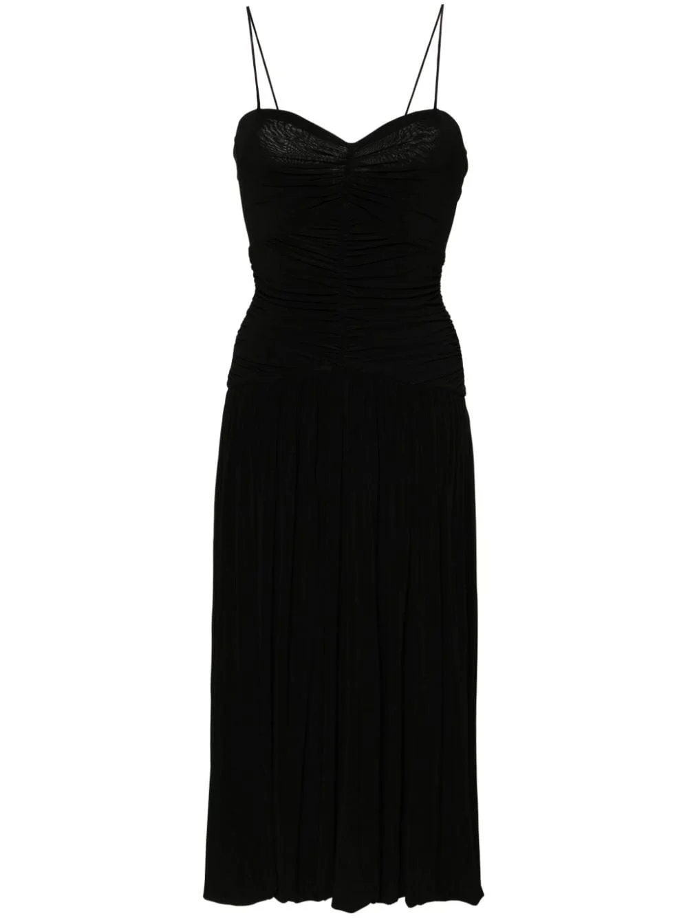 Elisabeth ruched midi dress Highlights - Black - Stretch-design - Ruched detailing - V-neck - Rubber grips - Concealed rear hook and zip fastening - Spaghetti straps - Pleated skirt - Straight hem - Mid-length Imported Composition Lining: Viscose 92%, Spandex/Elastane 8% Outer: Viscose 92%, Polyester 80%, Elastodiene 20%, Spandex/Elastane 8% SIZE & FIT Model measurements Height 5 ft 11 in(1.8 m) Bust/Chest 34.25 in(87 cm) Hips 35.82 in(91 cm) Waist 24.8 in(63 cm) FittingInformation Designed for a close fit at the chest and waist with a loose fit at the hip Made from a midweight stretch fabric, this piece offers elasticity and flexibility when worn This piece fits true to size – take your usual size Washing instructions Hand Wash