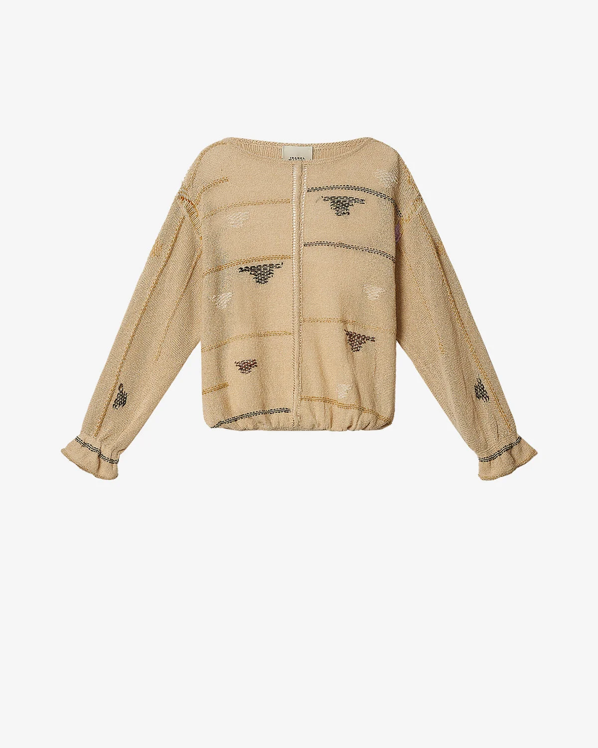 Ecru silk and linen bourette knit sweater Flowing and comfortable Round neckline Wide armholes Long sleeves Tapered elasticated cuffs Ladder-stitch knit and graphic jacquard details Fitted elastic waist Style: PU0884FAD2L03I23EC 48% linen, 48% silk, 4% polyamide Care & Sustainability Cold hand wash with suitable detergent For more details, see the instructions on the composition label the history and environmental impact of this product