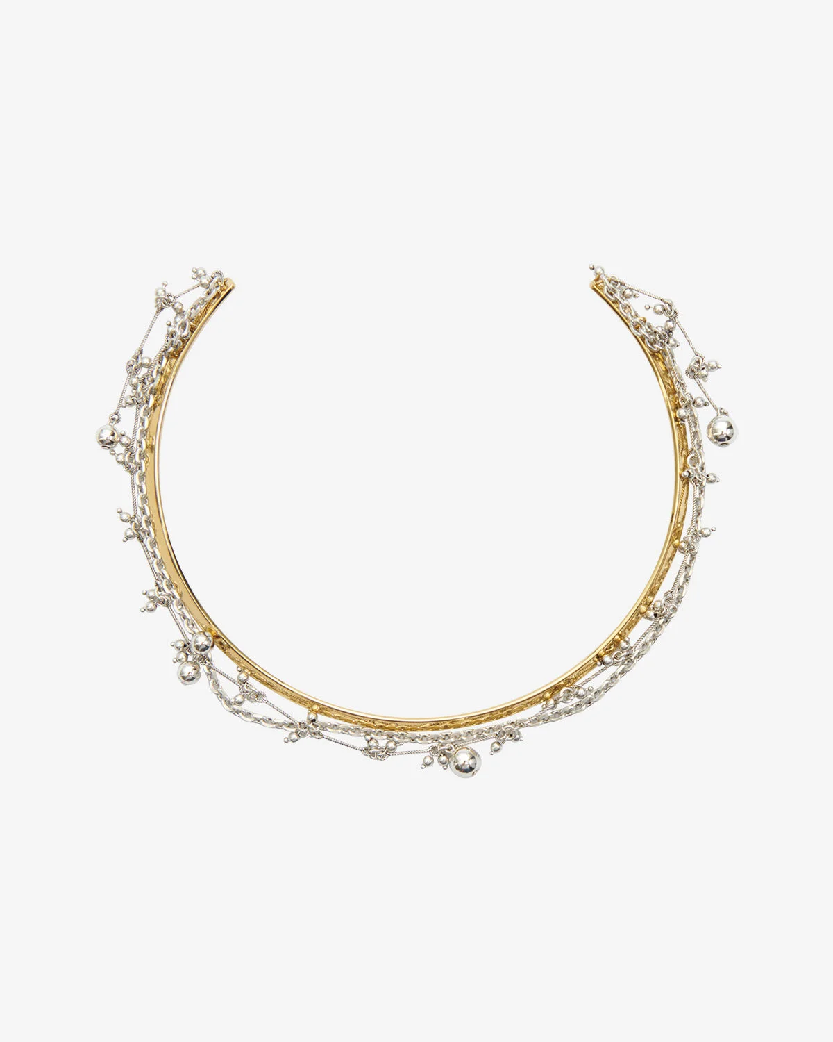 Gold-finish brass torque necklace with engraved "Isabel Marant" logo, chain, and silver-finish metal beads Adjustable opening in back Style: RC0076FAC4B01BSIDO SHORT NECKLACE 90% brass, 10% resin