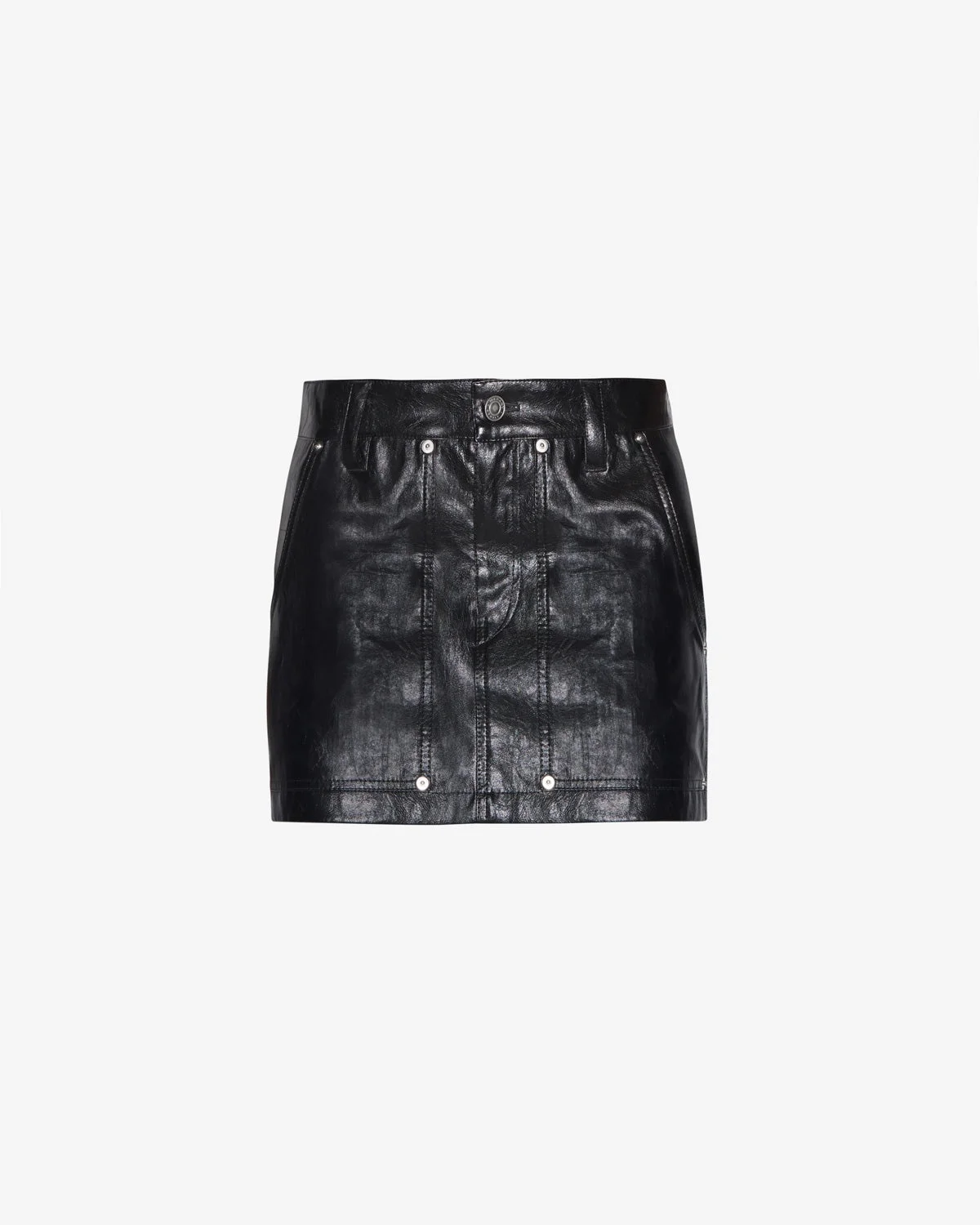 Short leather style skirt Fitted waistband with loops Metal button tab with a zipper Slant pockets with yokes Metal rivets Silver-finish metal details Fitted cut Style: JU0230FA-B3B01E ANAIS 58% polyurethane, 26% viscose, 5% other fibers, 5% cotton, 4% polyester, 2% stainless steel