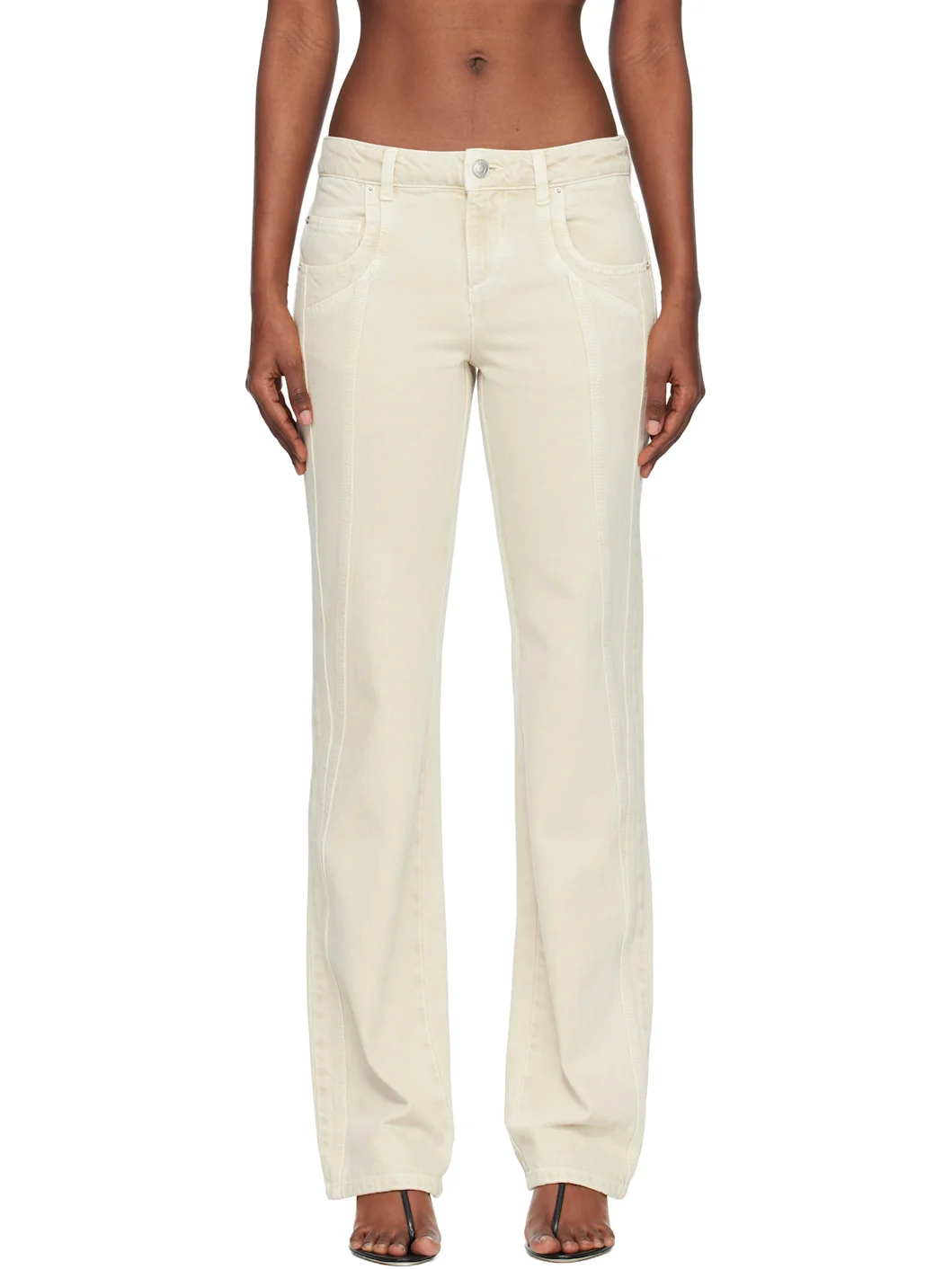 Non-stretch denim jeans. · Fading throughout · Belt loops · Five-pocket styling · Zip fly · Panel at legs · Leather logo patch at back waistband · Logo-engraved silver-tone hardware Supplier color: Ecru Body: 100% cotton. Trim: 65% polyester, 35% cotton. Made in Morocco 261599F069005