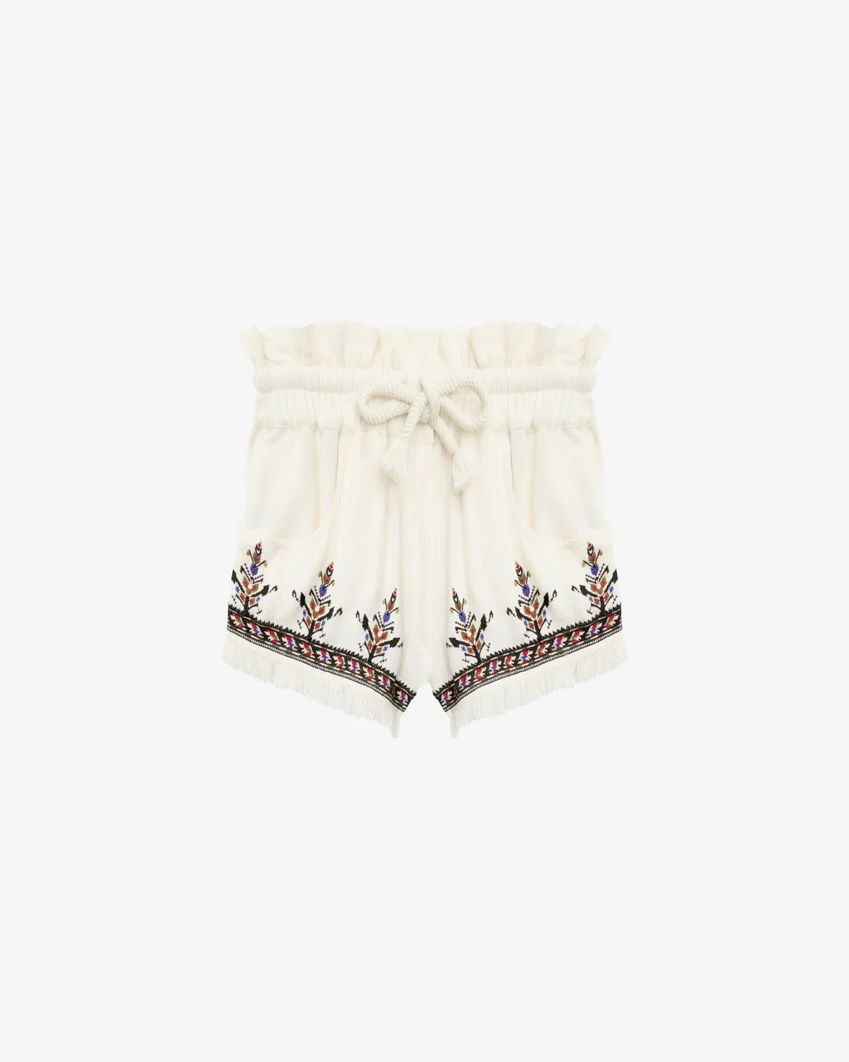 Short gauze shorts with graphic style embroidery Waistband with drawstring Done up with a metal hook and zipper Slant pockets on the sides Graphic style embroidery Fringed finishes Relaxed fit Style: SH0188FAC1J10E23EC KRISS 100% viscose