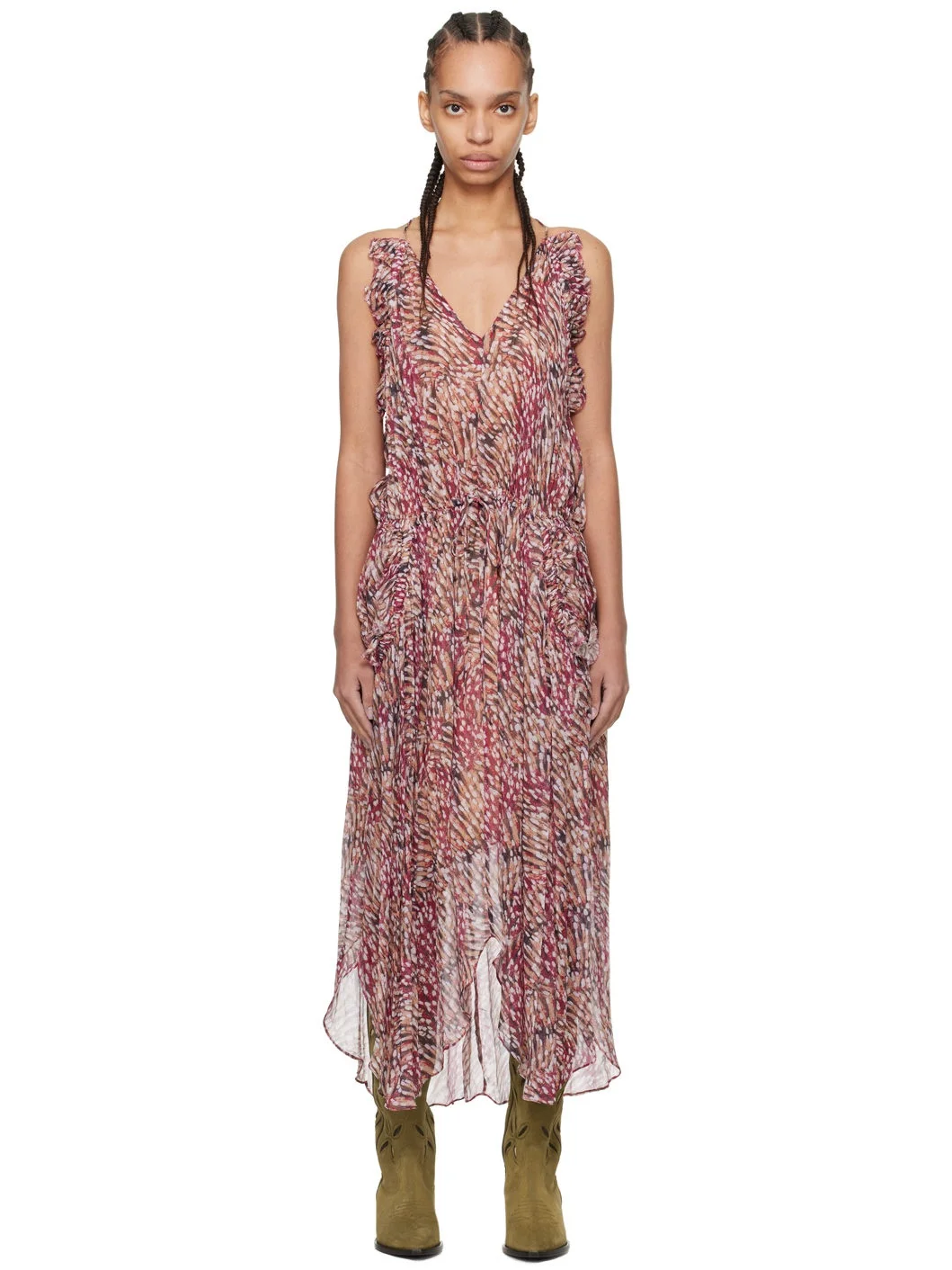 Semi-sheer viscose chiffon dress. Gathering, ruffled edges, and graphic pattern printed throughout. · Self-tie halter strap · Plunging V-neck · Drawstring at elasticized waist · Two-pocket styling · Asymmetric hem · Fixed shoulder straps · Keyhole at back collar · Partial viscose chiffon lining Supplier color: Raspberry 100% viscose. Made in India 241599F054005