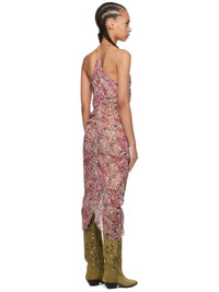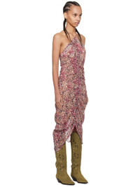 Viscose chiffon dress. Ruching and graphic pattern printed throughout. · Halter neck · Asymmetric hem · Concealed zip closure at racerback · Full viscose chiffon lining Supplier color: Raspberry 100% viscose. Made in India 241599F054003