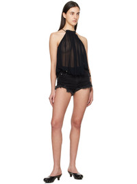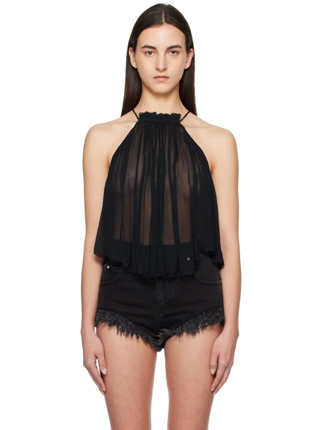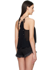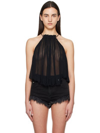 Lightweight semi-sheer viscose chiffon camisole. Gathering and graphic pattern printed throughout. · Halter neck · Self-tie spaghetti straps · Raw edge at cropped hem Supplier color: Black 100% viscose. Made in India 251599F111005
