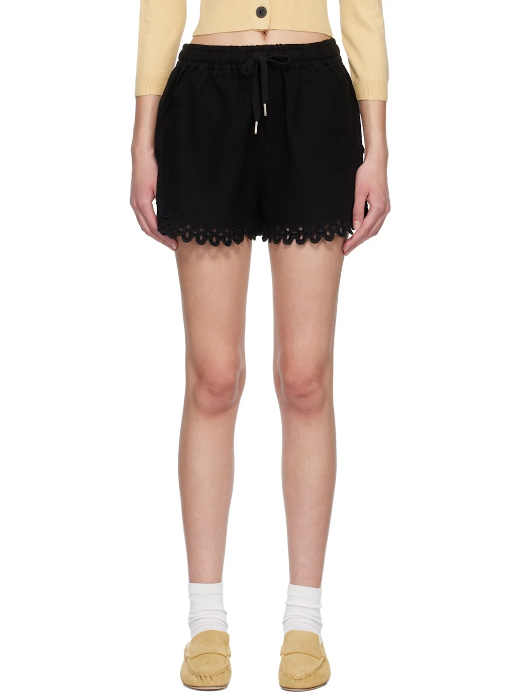 Cotton hopsack shorts. · Drawstring at elasticized waistband · Three-pocket styling · Broderie anglaise detailing at cuffs Supplier color: Faded Black Body: 100% cotton. Trim: 100% polyester. Made in India 261599F088007