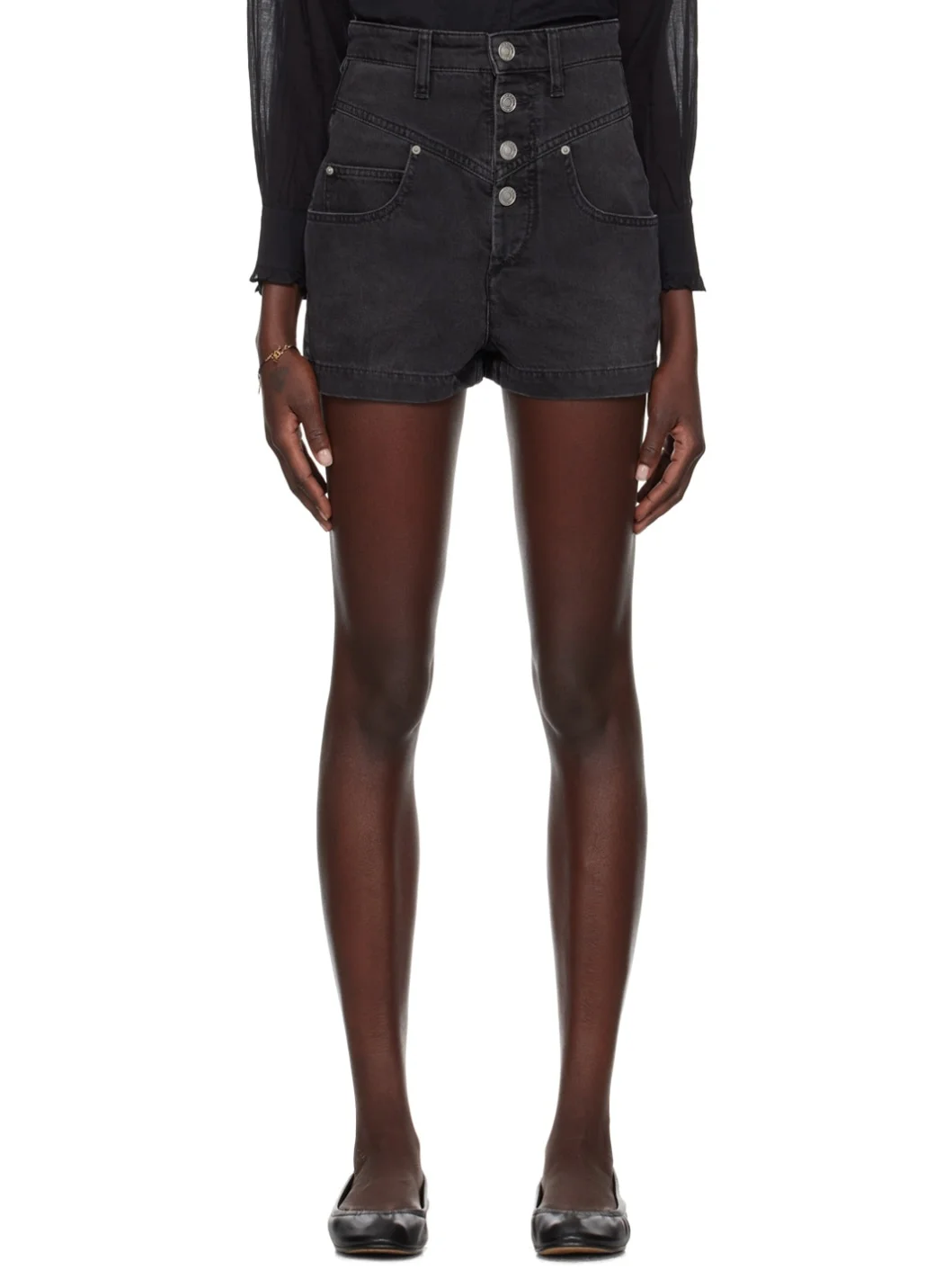 Garment-washed non-stretch denim shorts. Fading and whiskering throughout. · High-rise · Belt loops · Exposed button-fly · Four-pocket styling · Leather logo patch at back waistband · Partial jersey lining · Logo-engraved silver-tone hardware Supplier color: Faded black Body: 100% cotton. Lining: 65% polyester, 35% cotton. Made in Morocco 241599F088002