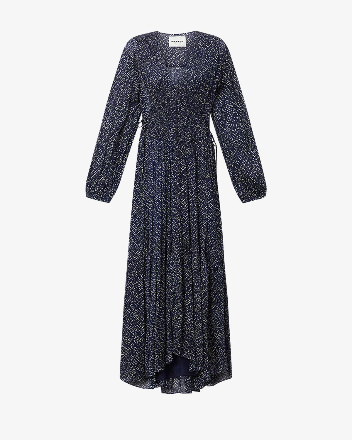 Long printed muslin dress V-neckline extending into a delicate button tab Long puff sleeves with tapered elasticated cuffs Chest seam and sheer smock detailing Adjustable waist with side ties adorned with metal beads Lined skirt Flared cut and asymmetrical hem Style: RO0798FBD1J08E30MI BRIANE 100% viscose Care & Sustainability Dry clean only For more details, see the instructions on the composition label the history and environmental impact of this product