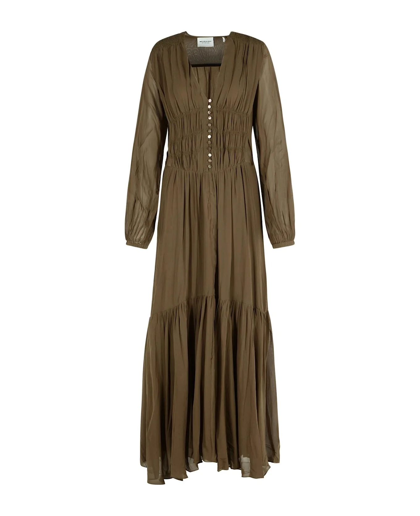 Long georgette dress, V-neck, front buttoning, pleated and curled details, long crinkled sleeves, thin cuffs with buttons, tight waist with drawstring, laces with metal trim, relaxed fit with adjustable waist. Composition: 100% viscose Made in: India Color: GREEN Model number: C3J01ERO0798FA