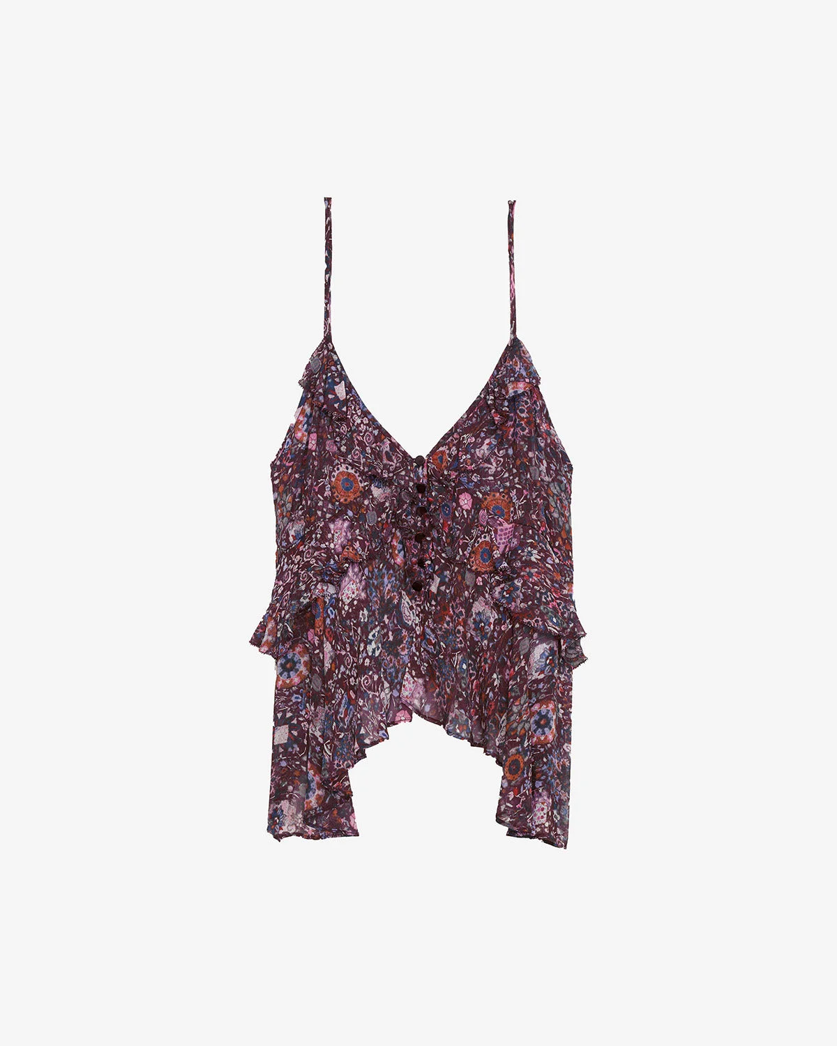 Frilly printed georgette top Low-cut V-neckline Thin straps Buttoned front Asymmetrical hem Flared and flowing Style: HT0672FAC3J01E86PM BRIARA 100% viscose