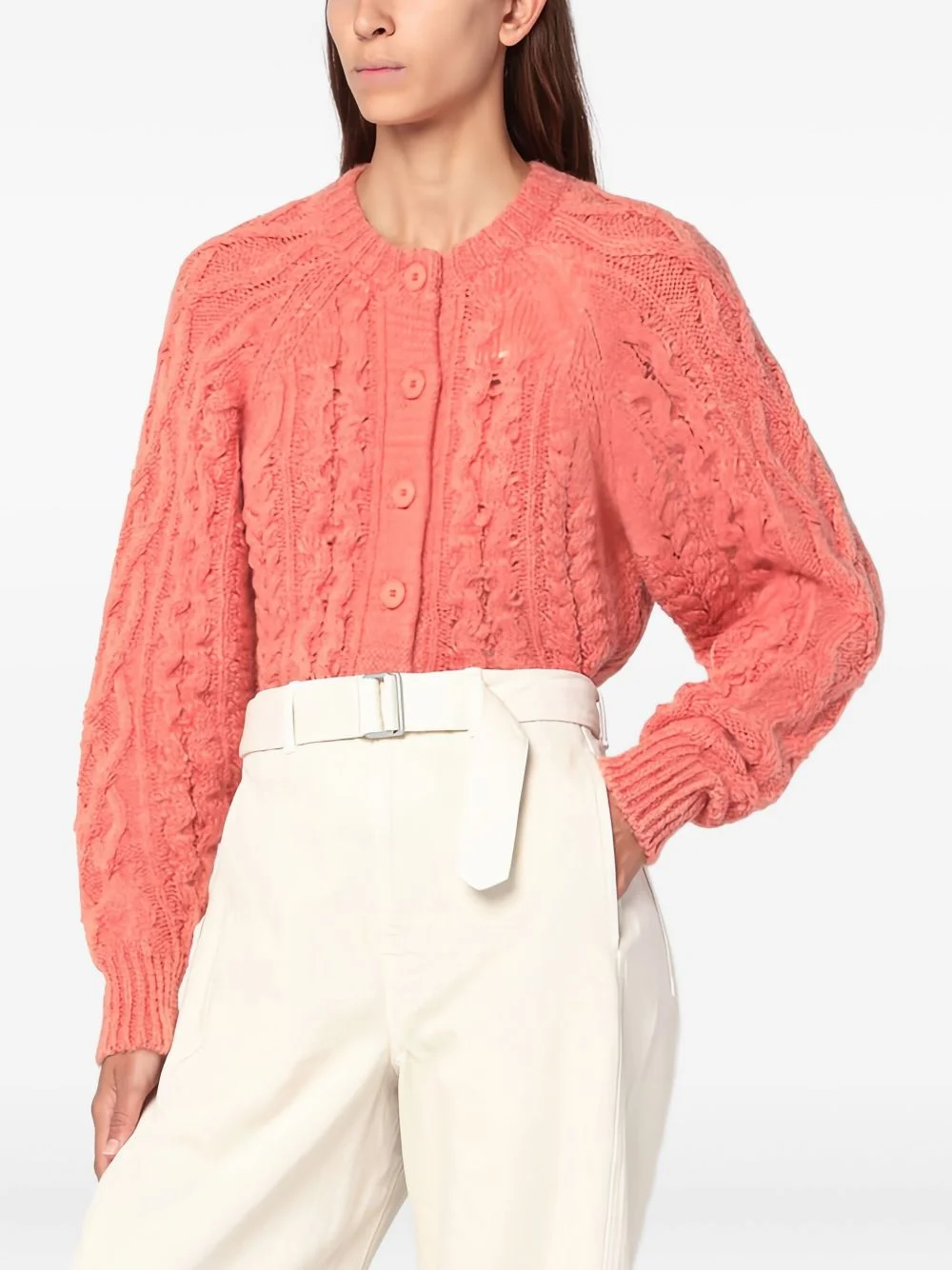 cable-knit buttoned cardigan Highlights - Coral pink - Cable knit - Button fastening - Round neck - Long sleeves - Ribbed hem Made in Italy Composition Acrylic 36%, Polyamide 30%, Mohair 17%, Alpaca 17% Washing instructions Read Manufacturer Guidelines