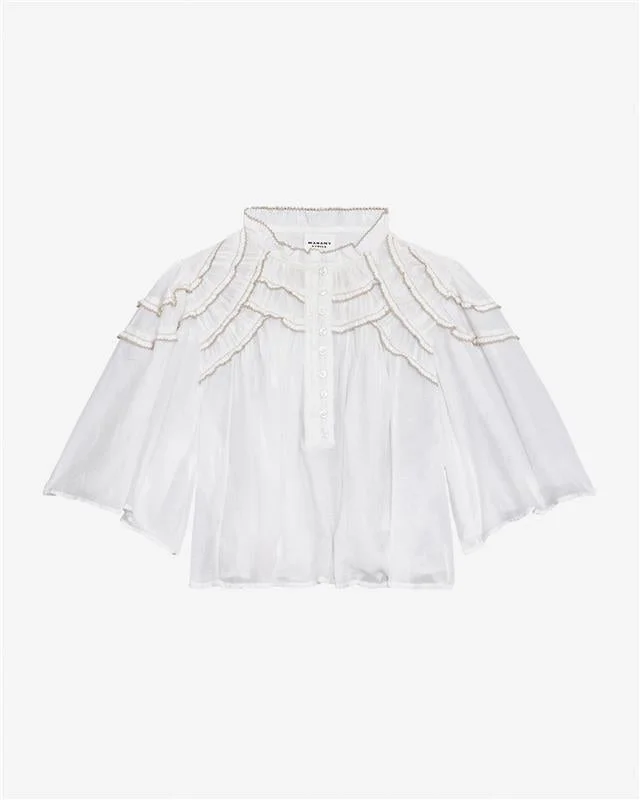 Gathered cotton voile blend top Round neckline with gathered finishes Buttoned front Gathered front and shoulder details Short loose sleeves Short and flared cut Style: HT0665FBB3J04E20WH CARMEN 80% cotton, 20% viscose