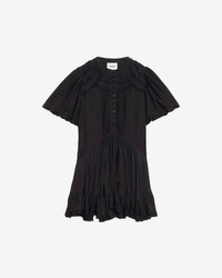 Gathered plain-colored lightweight cotton dress Round neck Buttoned front Gathered and frilly details Short frilly sleeves Gathered flared skirt with a frilly finish Serrated finishes Short and flared cut Style: RO0827FAB3J04E01BK CELYANA 80% cotton, 20% viscose