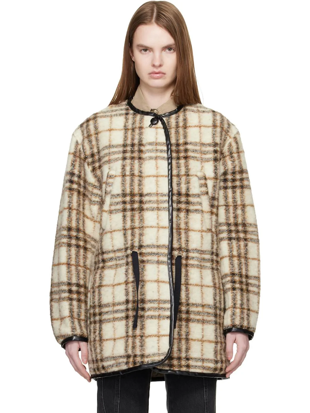 Brushed knit wool-blend jacket. · Stripes and buffed faux-leather trim throughout · Crewneck · Concealed button closure · Welt pockets at chest and waist · Self-tie drawstring at waist · Dropped shoulders · Full taffeta lining Supplier color: Ecru/Ochre Body: 67% wool, 33% polyester. Trim 1: 65% polyurethane, 35% polyester. Trim 2: 100% cotton. Lining: 100% polyester. Pocket lining: 100% cotton. Made in Bulgaria 261599F063007
