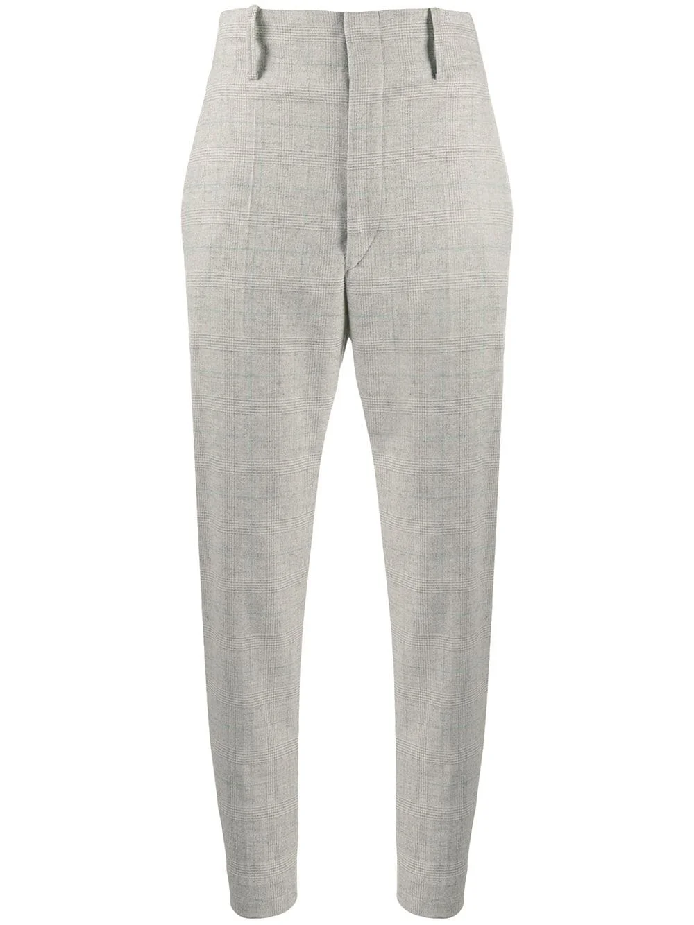 checkered tailored trousers Light grey cotton-wool blend checkered tailored trousers from Isabel Marant Etoile featuring a high rise, a waistband with belt loops, a slim fit, a cropped length, a concealed front fastening, side slit pockets and back pockets. Imported Composition Lining: Cotton 100% Outer: Wool 44%, Polyester 40%, Polyamide 15%, Spandex/Elastane 1% SIZE & FIT Model measurements Height 5 ft 10 in(1.78 m) Bust/Chest 27.95 in(71 cm) Hips 35.82 in(91 cm) Waist 24.01 in(61 cm) FittingInformation This piece fits true to size. We recommend you get your regular size Cut for a slim fit Made with a mid-weight stretch fabric Washing instructions Dry Clean Only